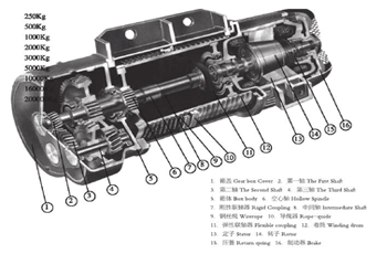 CD1型電動葫蘆主要結構:減速器,運行機構,卷筒裝置,吊鉤裝置,聯(lián)軸器,軟纜電流引入 器,限位器.電機采用錐形轉子電動機,集動力與制動力于一體.